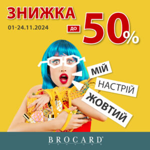Акція «До -50%. Мій настрій – жовтий!» діє в магазинах парфумерії та косметики BROCARD, інтернет-магазині BROCARD.UA та мобільному застосунку BROCARD в Україні 01-24.11.2024. За умовами акції, на визначений перелік товарів надається знижка до 50%, що вказана на жовтих цінниках у стаціонарних магазинах. Під час акції не діють інші акції та знижки, в тому числі за дисконтними картками. При покупці з використанням подарункових карток знижка діє лише при оплаті різниці між ціною реалізації товару без знижки та сумою номіналів подарункових карток. Деталі акції та перелік акційних товарів – у консультантів.